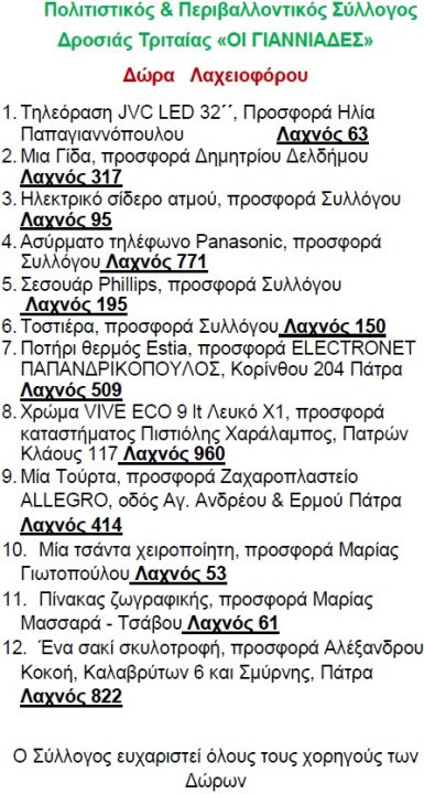 28 August 2023 28 August 2023Categories Announcements"GIANNIADES", Lottery Gifts 28-08-2023"GIANNIADES", lottery gifts 28/08/2023 Summer lottery results. Many thanks to the donors and all those who […]