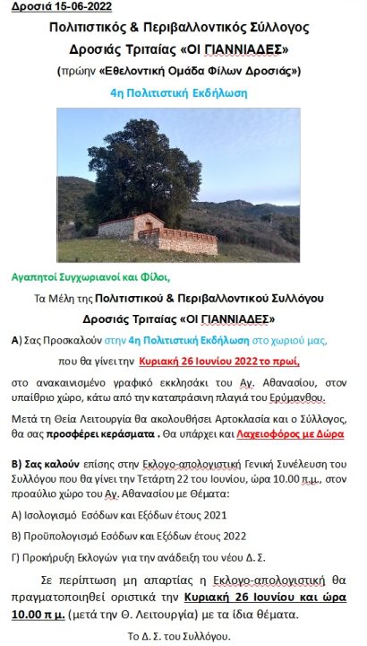 Cultural & Environmental Association, Drosia Tritaias "OI GIANNIADES" Drosia, April 2022. Registration, Annual Contribution for […]