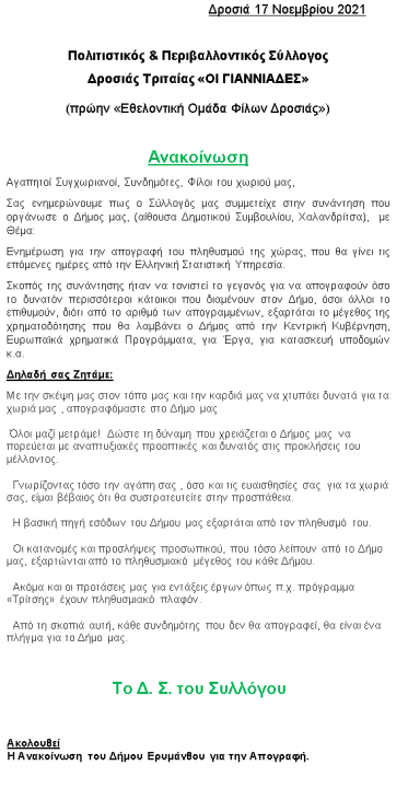 Cultural and Environmental Association "GIANNIADES" of Tritaia, Patras Announcement of the Municipality of Erymanthos for the Census 14-11-21