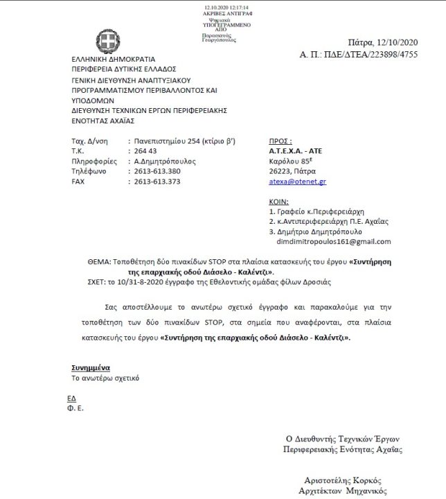 12 October 2020 12 October 2020Categories AnnouncementsEvolution of the Road Maintenance request of the Municipality of Erymanthos and installation of STOP signs, 12 October 2020"Volunteer Group of Friends of Drosia" Tritaia, Patras Construction of the Provincial Road Drosia – 1st ridge (chapel) […]