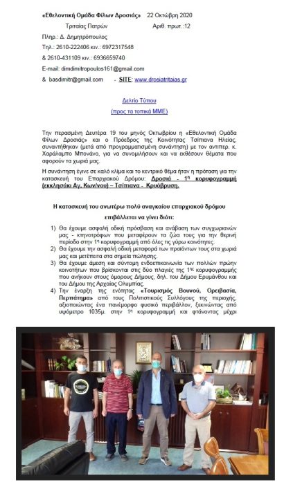 22 October 2020 22 October 2020Categories ActionsVolunteer Group, Construction of the Provincial Road Drosia – 1st ridge (chapel of Agios Konstantinos) – Tsipiana – Kryovrysi, 22-10-20"Volunteer Group of Friends of Drosia" October 22, 2020 Tritaias Patras No. prot.:12 Contact: D. Dimitropoulos Tel.: […]